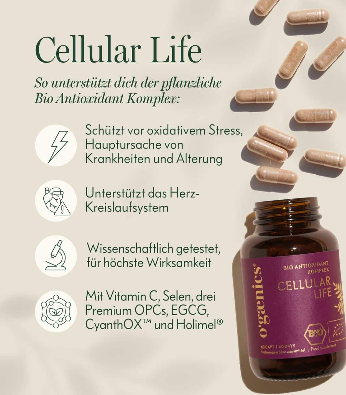 Cellular Life vereint die reinste Kraft der Natur, um deine antioxidative Abwehr täglich zu stärken. Alle Inhaltsstoffe sind nicht nur bio-zertifiziert, sondern auch wissenschaftlich getestet, um sicherzustellen, dass sie optimal zum Zellschutz betragen.