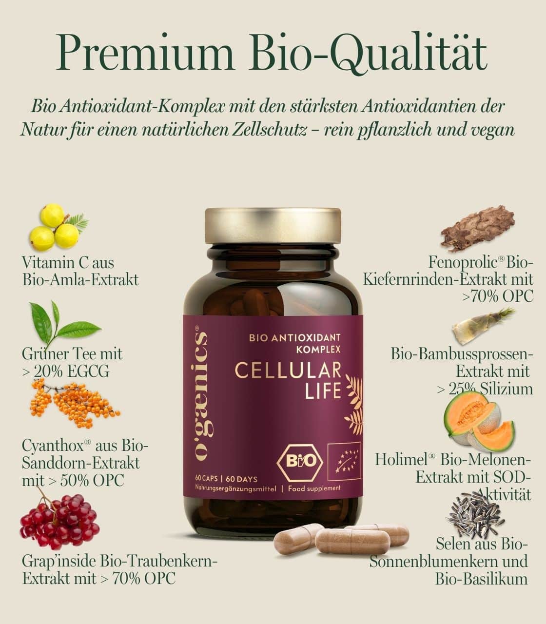 Cellular Life ist zu 100 % bio-zertifiziert und basiert ausschließlich auf pflanzlichen Inhaltsstoffen. Es kombiniert höchste Bio-Qualität mit wissenschaftlich fundierten Dosierungen, um eine maximale Wirkung zu gewährleisten – alles in nur einer Kapsel pro Tag.
