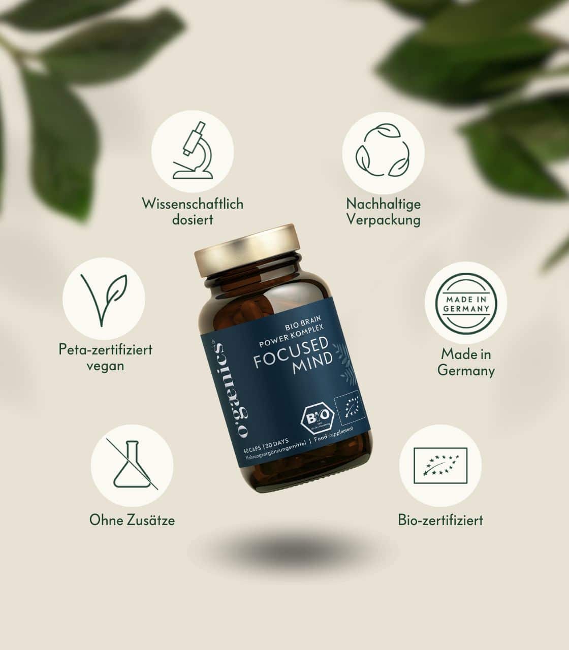 Ja. Focused Mind ist komplett koffeinfrei – die Formulierung basiert ausschließlich auf Pflanzen, Vitalpilzen und Mineralstoffen, die deine Konzentration auf natürliche Weise fördern, ohne anregende Stimulanzien.