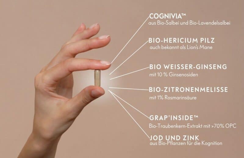 - Supplemented with extracts of organic lion’s mane, organic white ginseng, organic lemon balm and organic grape seeds with standardized OPC content