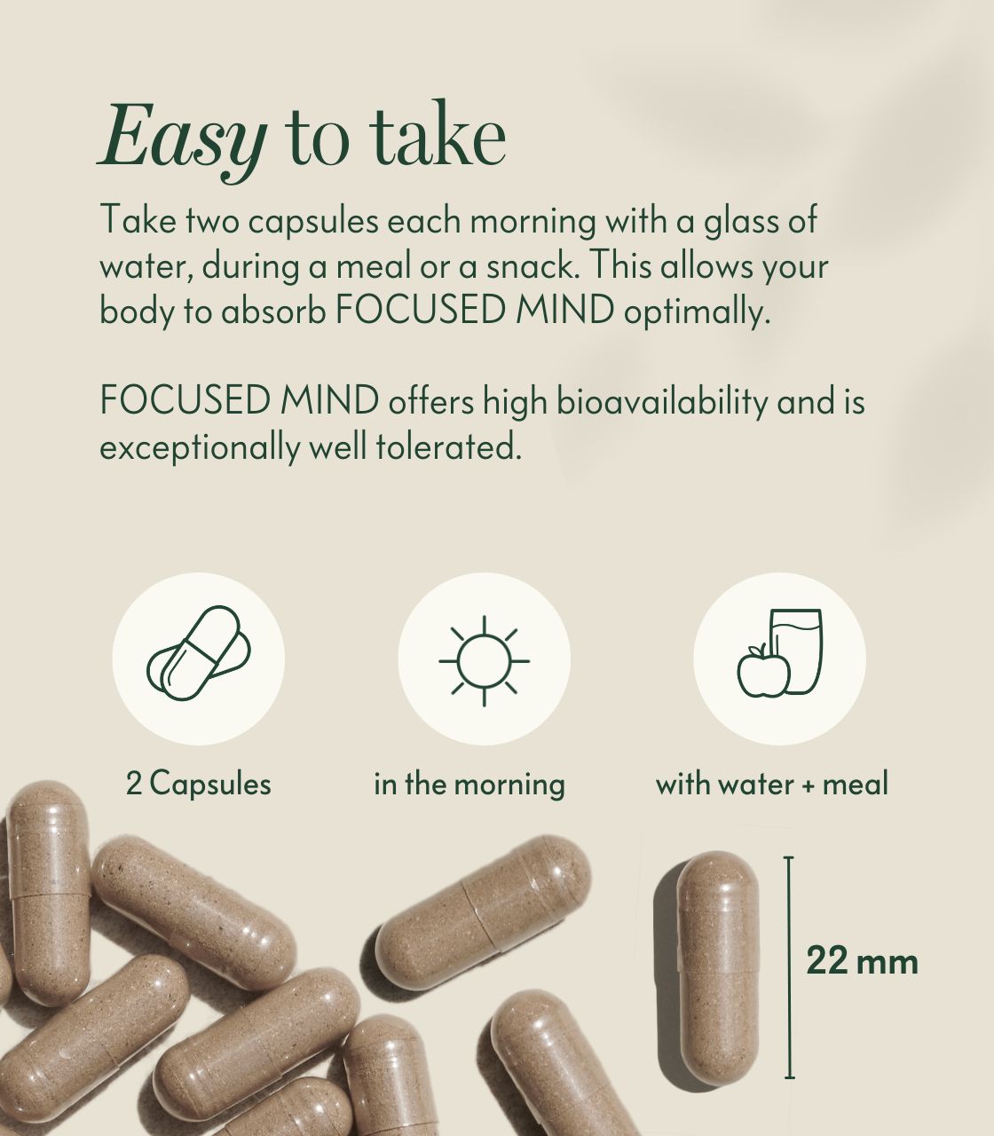 Take two capsules in the morning with a little water – ideally with a meal. As Focused Mind contains no caffeine, you can take it on sensitive days without affecting your sleep or cardiovascular system.