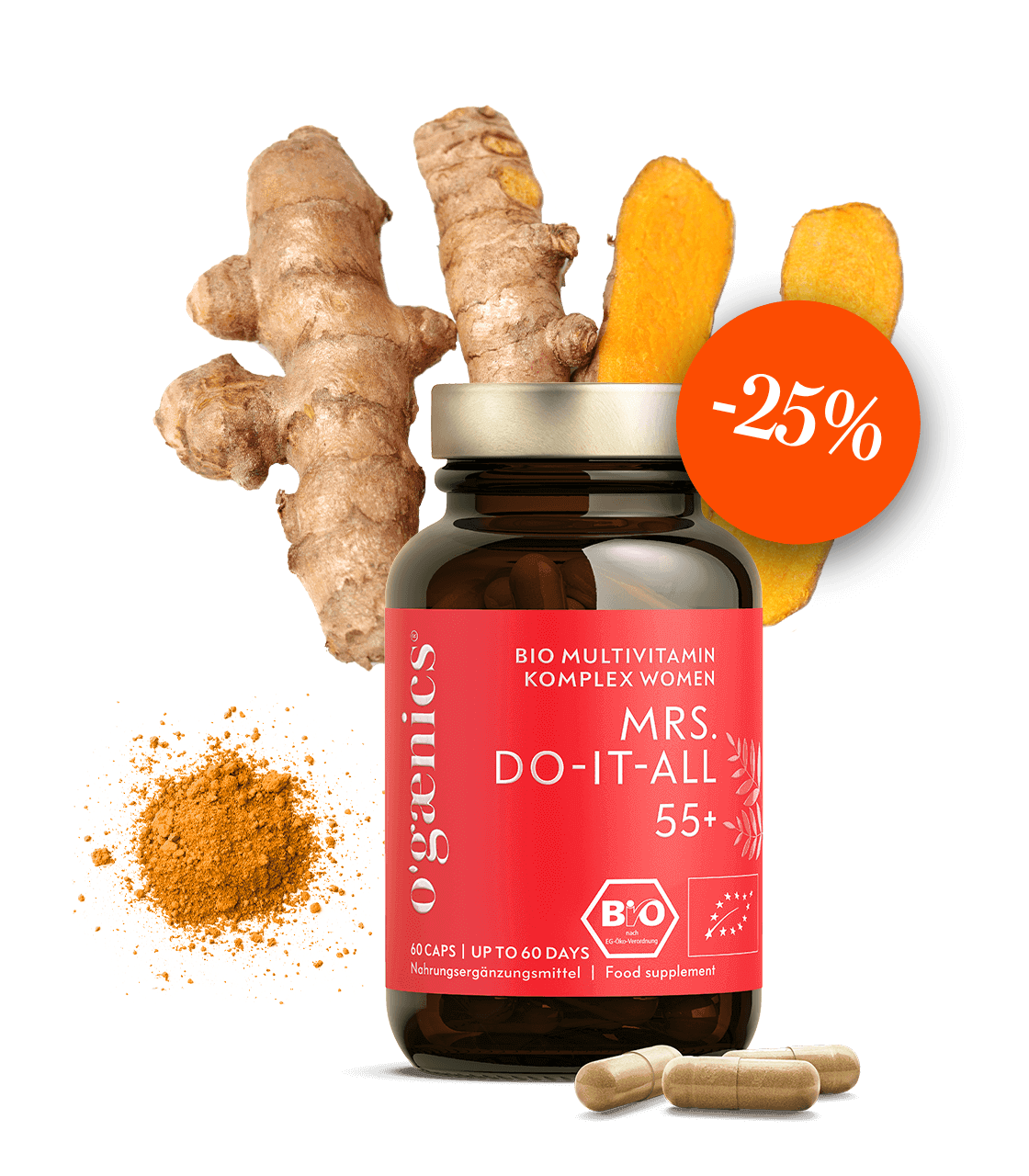 MRS DO-IT-ALL 55+ Organic Multivitamin Complex is the ideal all-in-one organic herbal nutritional supplement for women 55 years and older. With just one to two capsules a day, it provides you with the 17 most important plant-based vitamins and minerals from vitamin A to zinc together with bioactive plant extracts that support your energy, healthy muscles and joints and healthy aging in the post-menopause. With a potent premium turmeric extract for the prevention of inflammation.