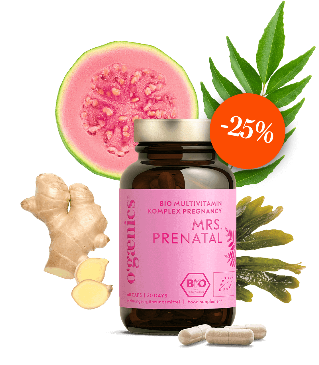 MRS Prenatal contains only bioactive, plant-based nutrients from 26 certified organic foods – in an activated form that is easily utilized by the body. No synthetic folate, no artificial vitamin D, no artificial additives. But instead: certified organic quality, stomach-friendly, vegan and highly effective.
