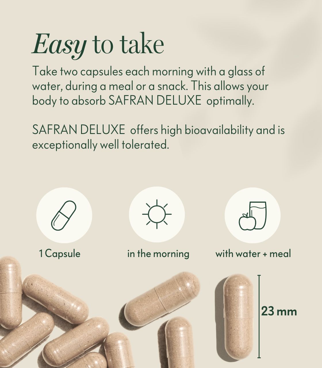 Take one capsule of Saffron Deluxe daily with a glass of water with a meal.