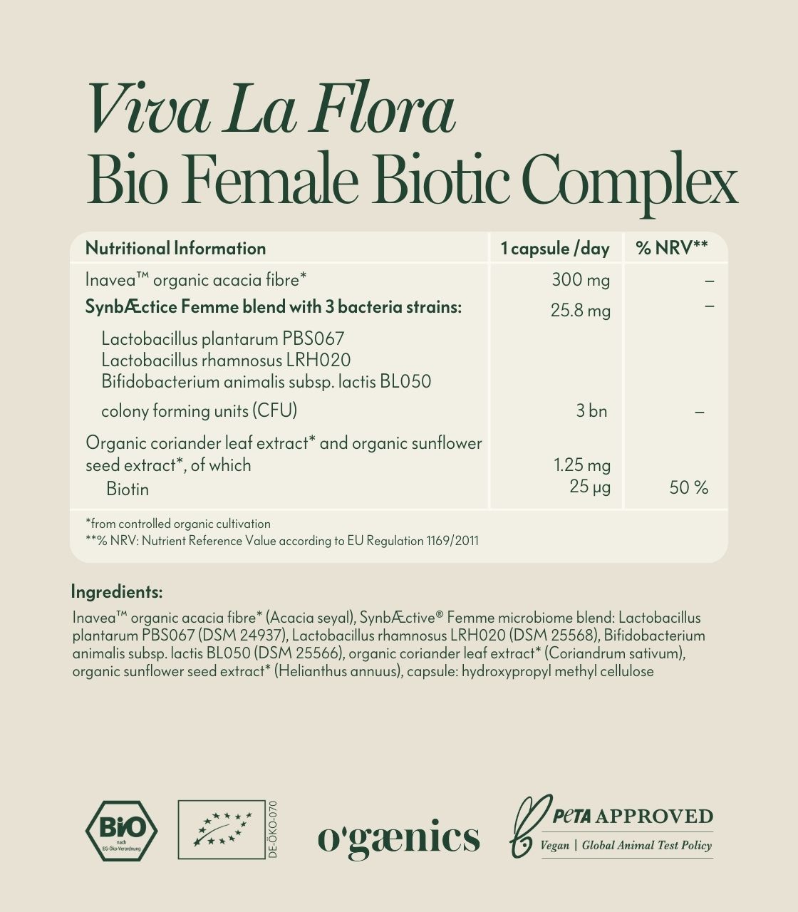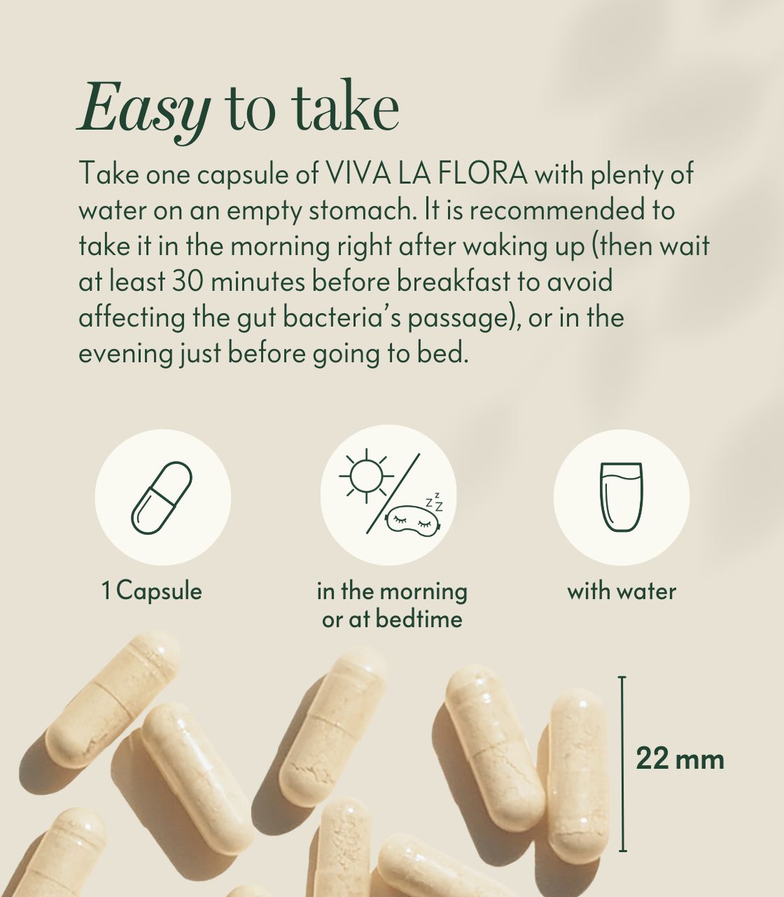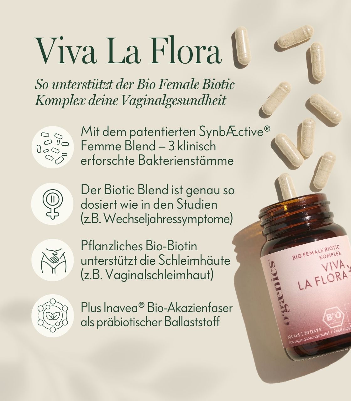 - Viva La Flora supplements your diet with selected bacterial strains that enter the vaginal flora naturally via the intestinal-vaginal axis. In this way, it supports the microbiotic balance from within – sustainably and preventively.