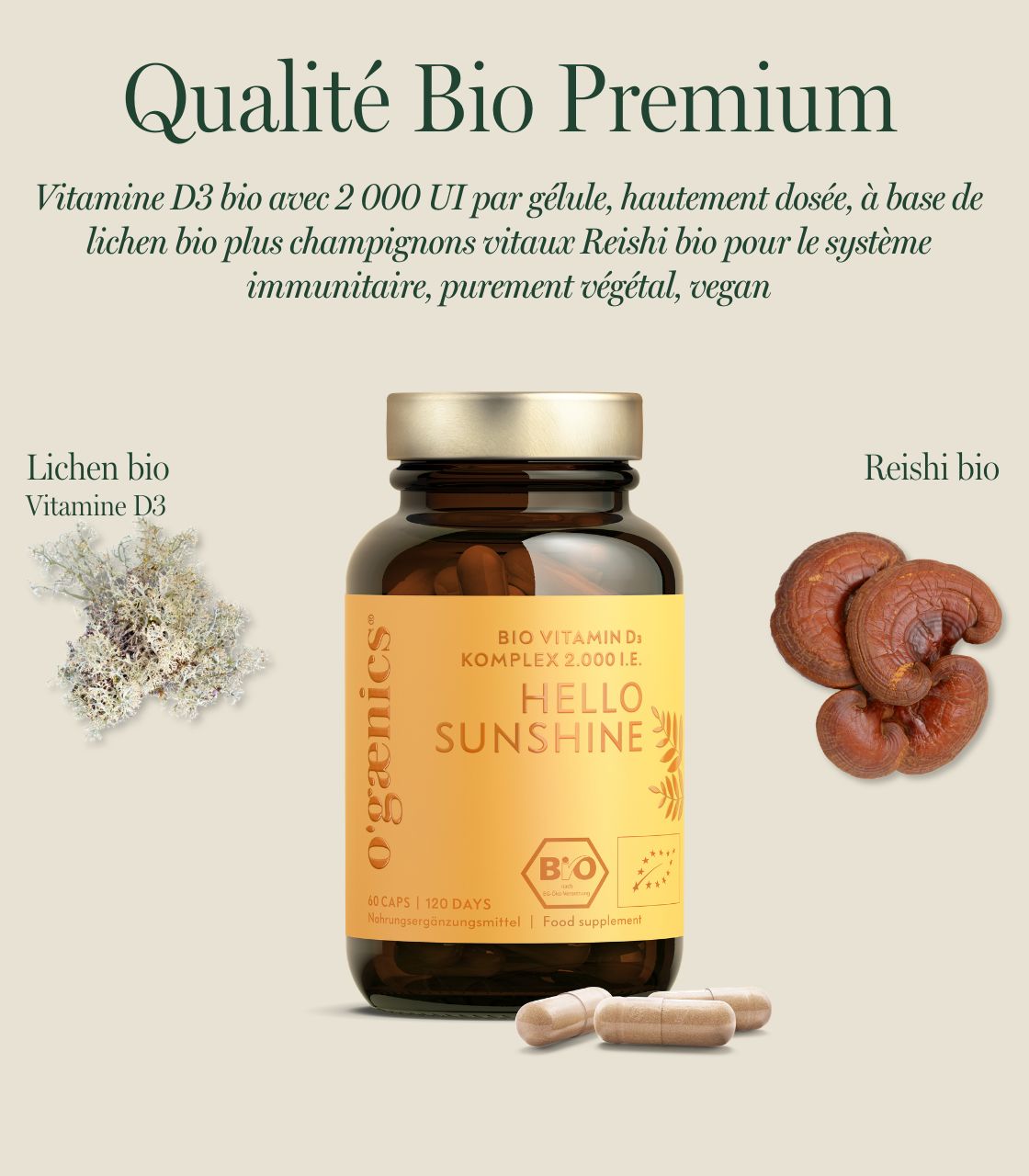 HELLO SUNSHINE combine la vitamine D3 bio la plus pure, extraite du lichen, avec de la poudre de rizhi bio naturelle - soigneusement sélectionnée et traitée avec un soin tout particulier.