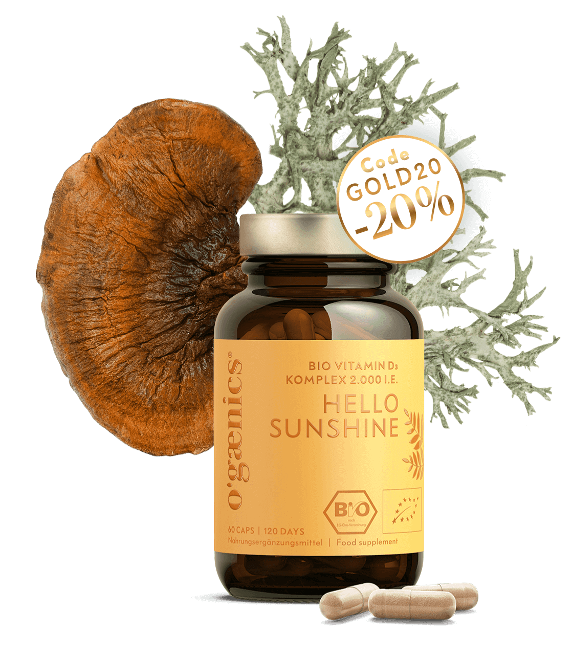 Vivez la puissance du soleil dans chaque gélule ! HELLO SUNSHINE vous apporte 2.000 UI de vitamine D3 provenant de lichens purement biologiques - combinés avec le champignon rizhi bio adaptogène. Cette formule naturelle soutient votre système immunitaire, renforce les os et les muscles et vous aide à optimiser votre taux de vitamine D de manière saine.