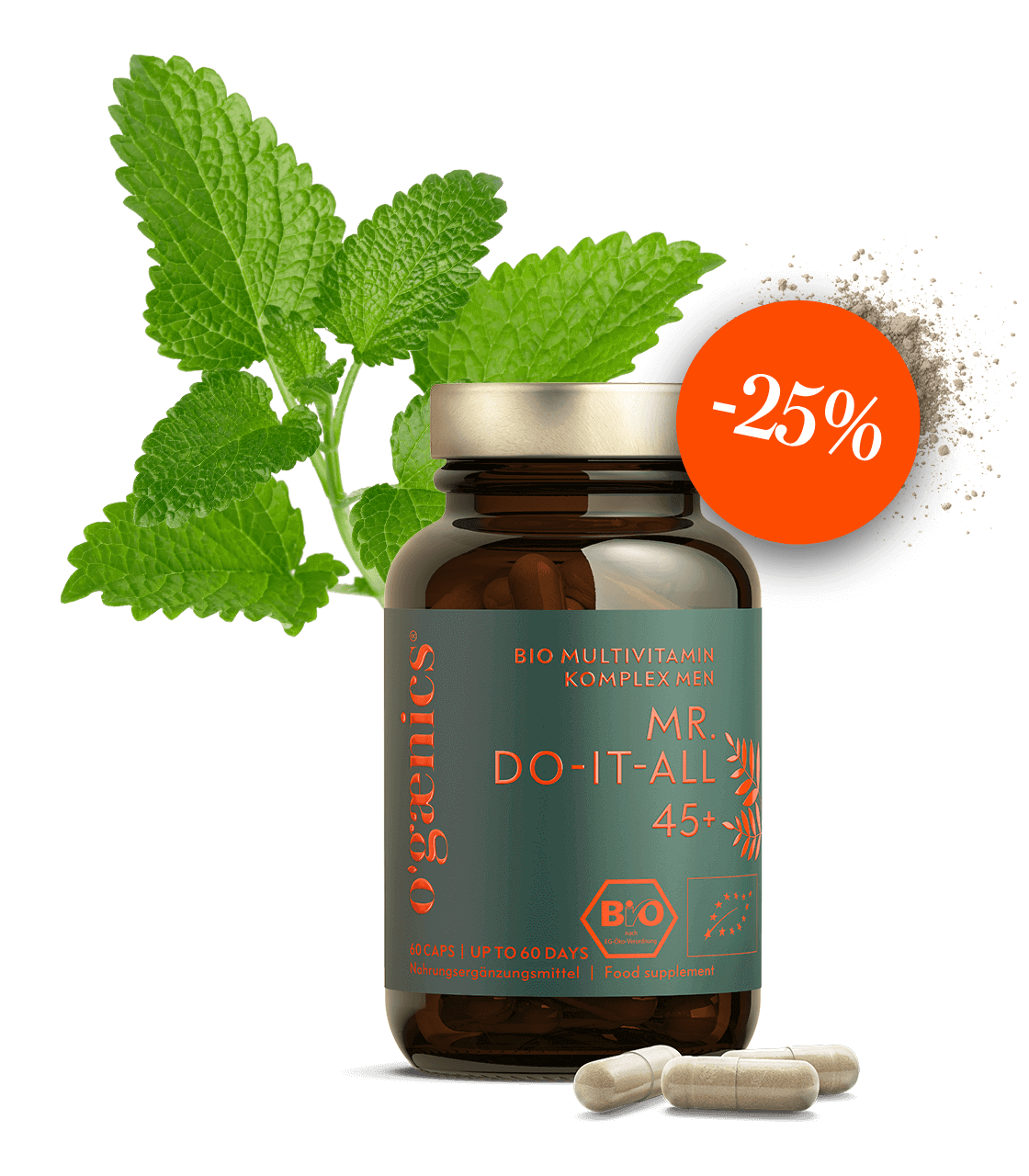 La multivitamine bio pour les hommes à partir de 45 ans : avec plus de 40 extraits naturels de plantes bio, des super aliments et des micronutriments naturels, ce supplément tout-en-un te fournit tout ce dont ton corps a besoin dans la deuxième moitié de la vie - pour l’énergie, la santé du cœur et de la prostate, la force musculaire et la force mentale. Avec Bluenesse® de mélisse bio - étudié cliniquement pour la résistance au stress et la stimulation de la concentration.