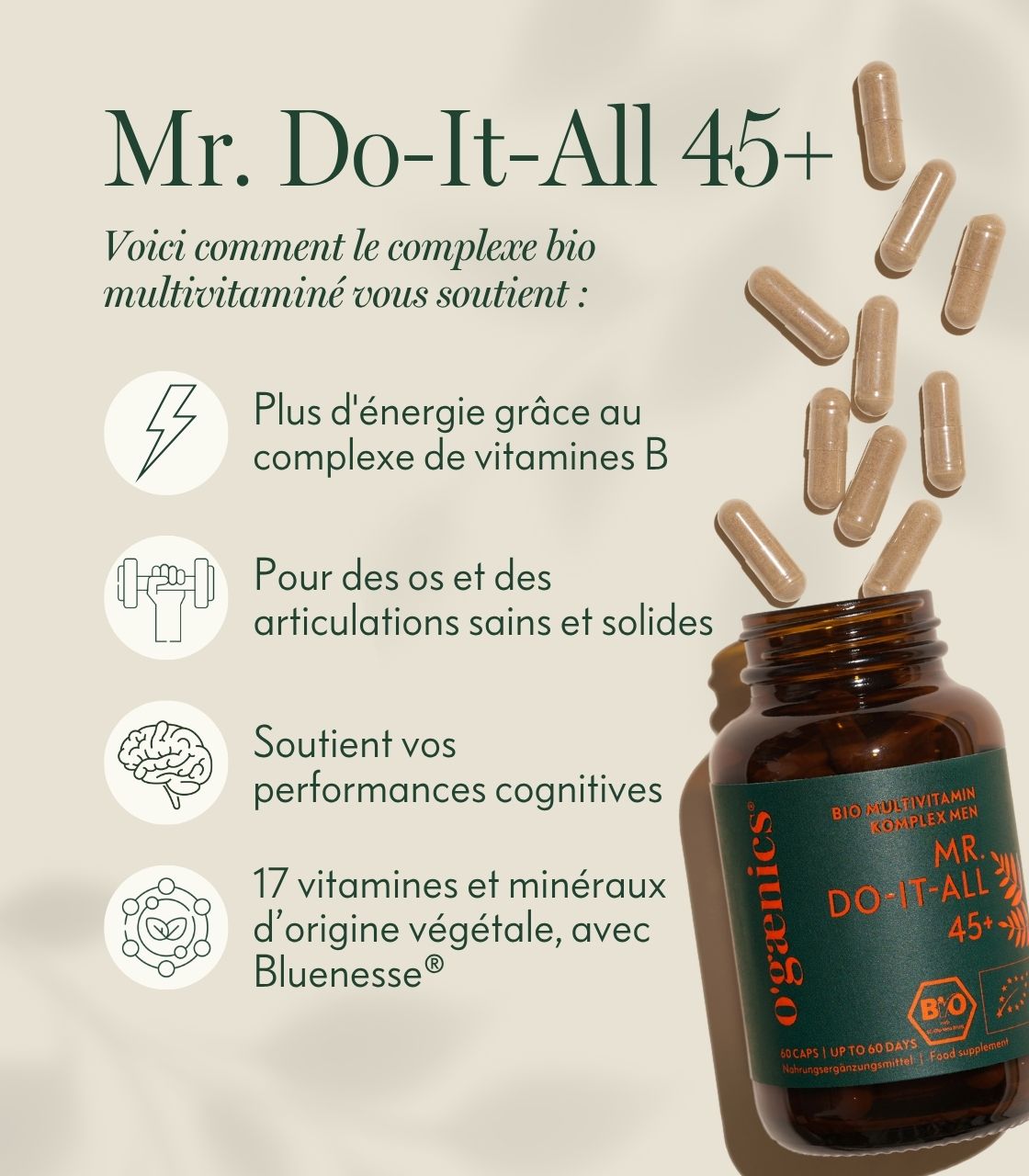 Oui - MR DO-IT-ALL 45+ est délibérément conçu pour te fournir des soins complets. De l’énergie, du soutien du cœur et de la prostate aux muscles, aux os et au système immunitaire, en passant par l’équilibre du stress et de la concentration, tous les nutriments essentiels sont couverts.