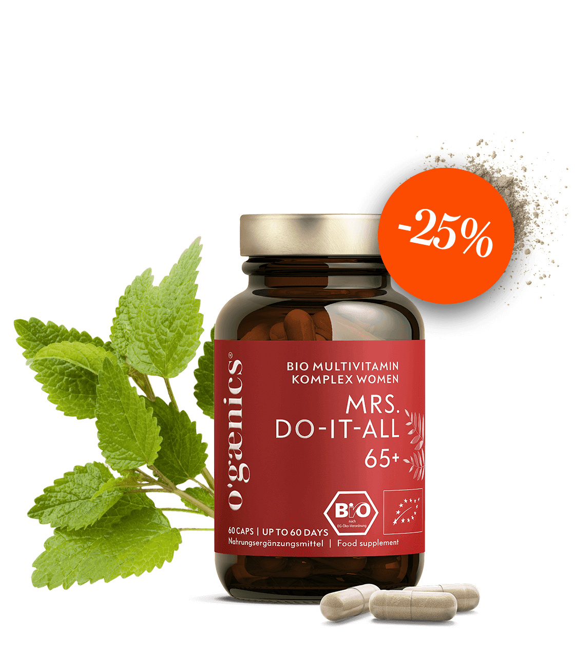 MRS DO-IT-ALL 65+ est votre solution tout-en-un qui contient des ingrédients de qualité biologique scientifiquement prouvés et qui a été formulée pour une biodisponibilité ultime. Les multivitamines bio portent le label bio de l’UE et sont produites en Allemagne sans aucun additif, sans génie génétique et 100% végétaliennes certifiées Peta. Elles sont emballées dans un bocal à pharmacie de qualité supérieure. Grâce à des contrôles de laboratoire stricts, nous garantissons sans compromis l’absence de substances nocives dans ce produit Ogaenics. Nos produits ne contiennent pas de vitamines ou de minéraux synthétiques.