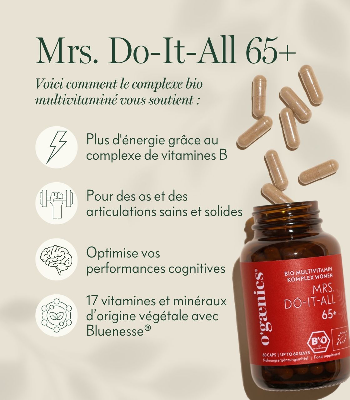 MRS DO-IT-ALL 65+ associe la science nutritionnelle de pointe à la puissance d’ingrédients botaniques certifiés biologiques, spécialement conçus pour répondre aux besoins des femmes de 65 ans et plus. Avec seulement une à deux gélules par jour, cette multivitamine bio unique soutient votre vitalité, votre santé mentale et physique et votre bien-être - pour une vie active et épanouie au-delà de 65 ans.