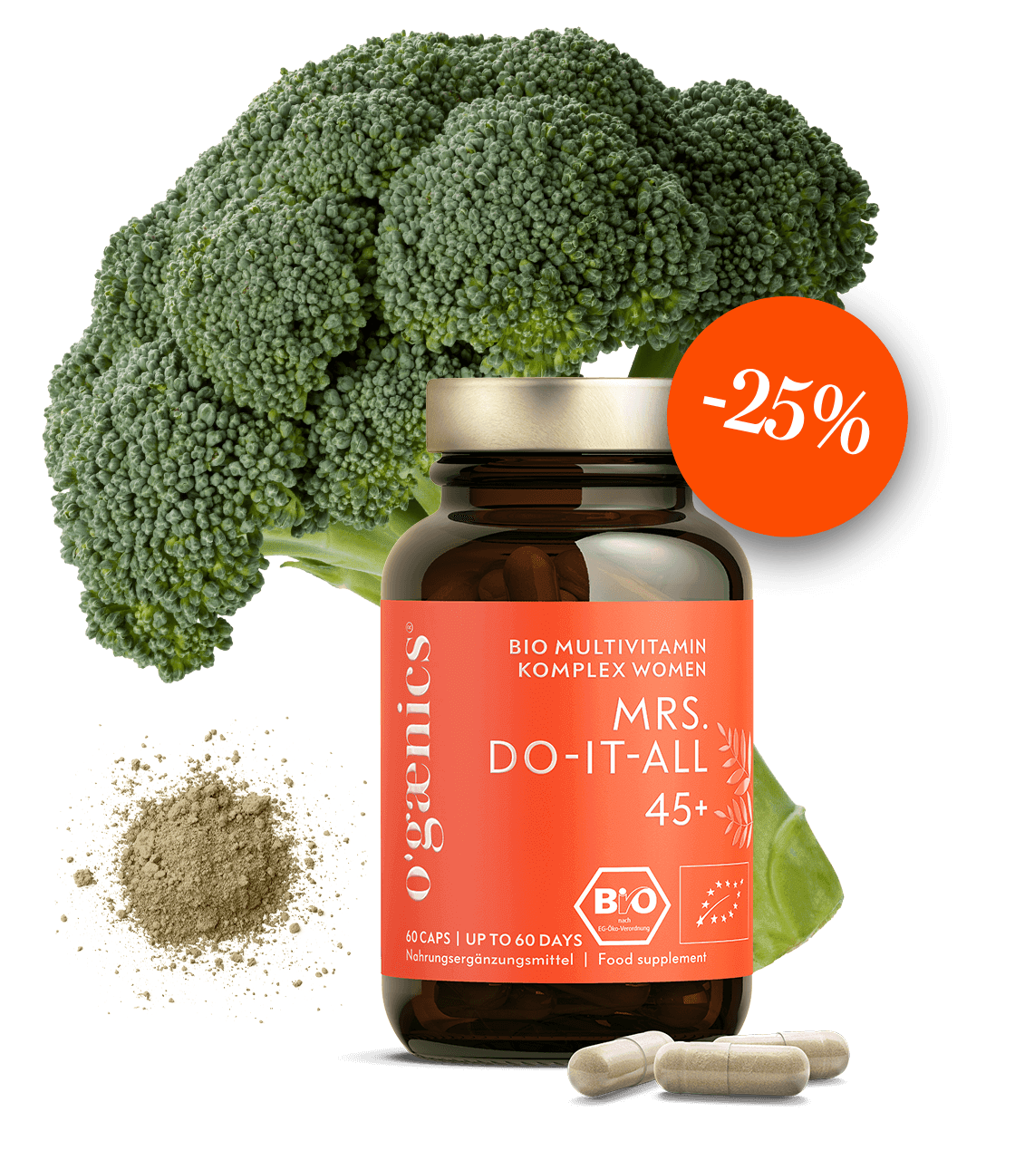 MRS DO IT ALL 45+ est un complément alimentaire bio complet tout-en-un qui fournit tous les nutriments essentiels qui ne peuvent pas être apportés en quantité suffisante par l’alimentation pour obtenir l’effet souhaité. À une exception près : le calcium et le magnésium.