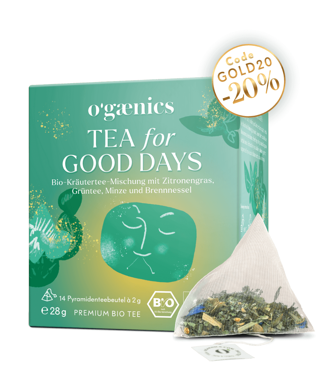 Le Tea for Good Days peut être conservé 24 mois à partir de sa production. Tu trouveras la date de péremption exacte sur le dessous de l’emballage. S’il est conservé correctement, le thé reste généralement consommable au-delà de cette période - l’arôme et la qualité peuvent alors éventuellement se modifier légèrement.