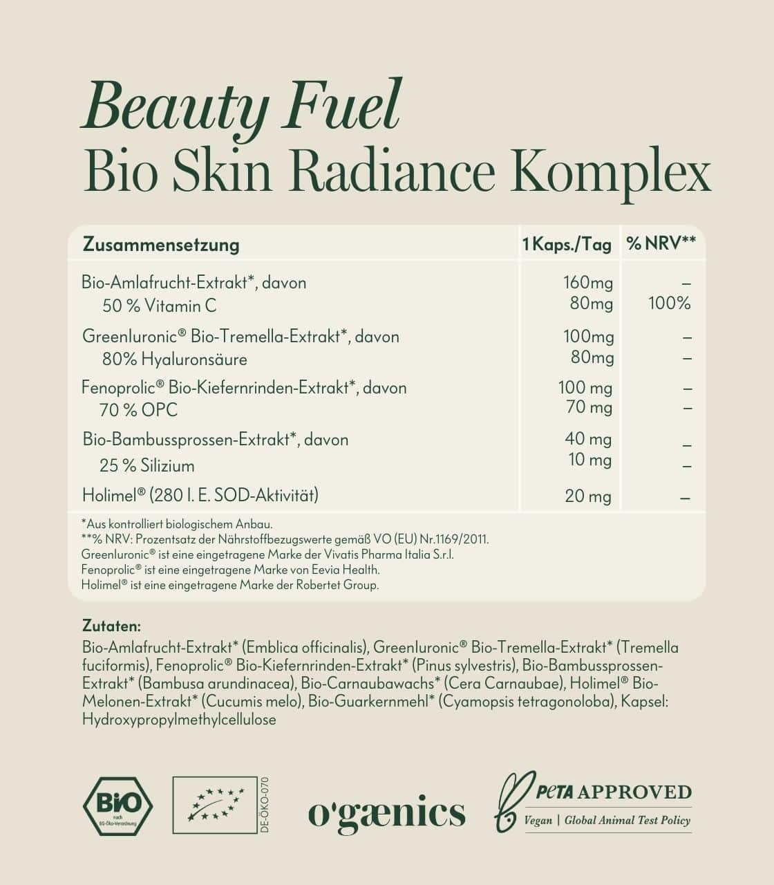 BEAUTY FUEL ist ein umfassendes Bio-Nahrungsergänzungsmittel für die Schönheit deiner Haut und zur Verzögerung der Hautalterung. Du kannst es gern mit anderen, ergänzenden Supplements aus dem Ogaenics Sortiment kombinieren. Wenn du Fragen zu einem Nahrungsergänzungsmittel hast, das du einnimmst, wende dich bitte an hello@ogaenics.com.