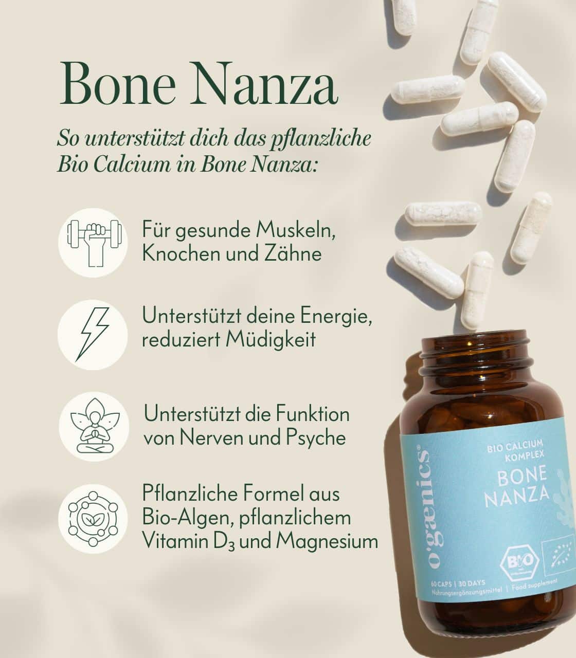BONE NANZA enthält die richtige Kombination aus bioaktiven, organischen Mineralstoffen, die dich optimal unterstützen. Sie ist besonders wichtig für dich, wenn du dich vegan ernährst, viel Sport treibst, dich gerade in einer Schwangerschaft, der Stillzeit oder in den Wechseljahren befindest.