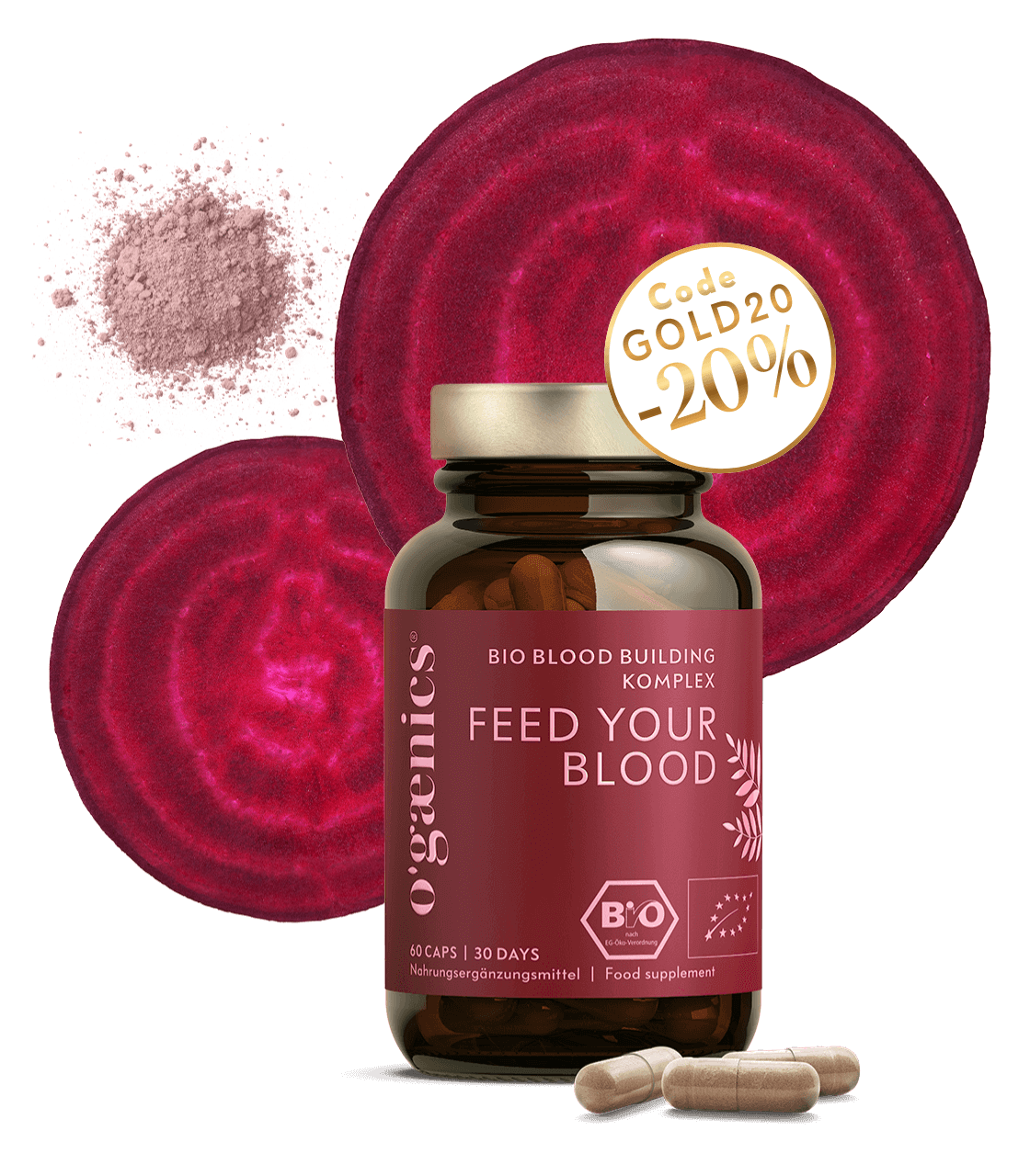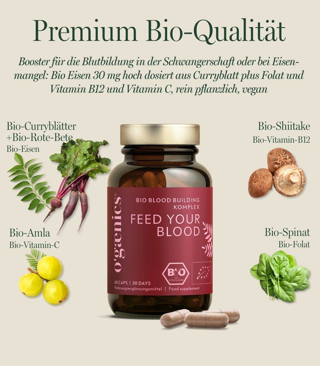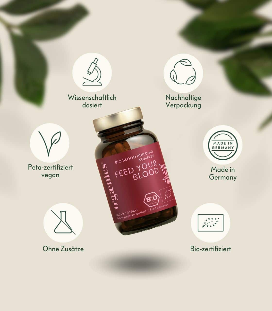 FEED YOUR BLOOD bietet dir die optimale, natürliche Unterstützung bei Eisenmangel. Unser Bio-Nahrungsergänzungsmittel ist speziell formuliert mit 30 Milligramm pflanzlichem Bio-Eisen, angereichert mit natürlichem Vitamin C, Vitamin B12 und Folat, direkt aus Bio-Pflanzenquellen. Diese Kombination fördert die Blutbildung effektiver als die Einnahme von Eisen allein – ein wissenschaftlich belegter Vorteil. Zudem hilft es, Müdigkeit spürbar zu reduzieren, ganz ohne unerwünschte Nebenwirkungen.