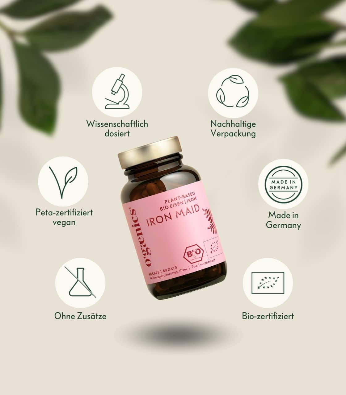 IRON MAID ist deine rein pflanzliche Grundversorgung mit Bio-Eisen und dem Wirkverstärker Vitamin C aus Premium-Rohstoffen in Bio-Qualität, handverlesen zusammengestellt, ohne Zusätze, ohne Gentechnik und 100% vegan.