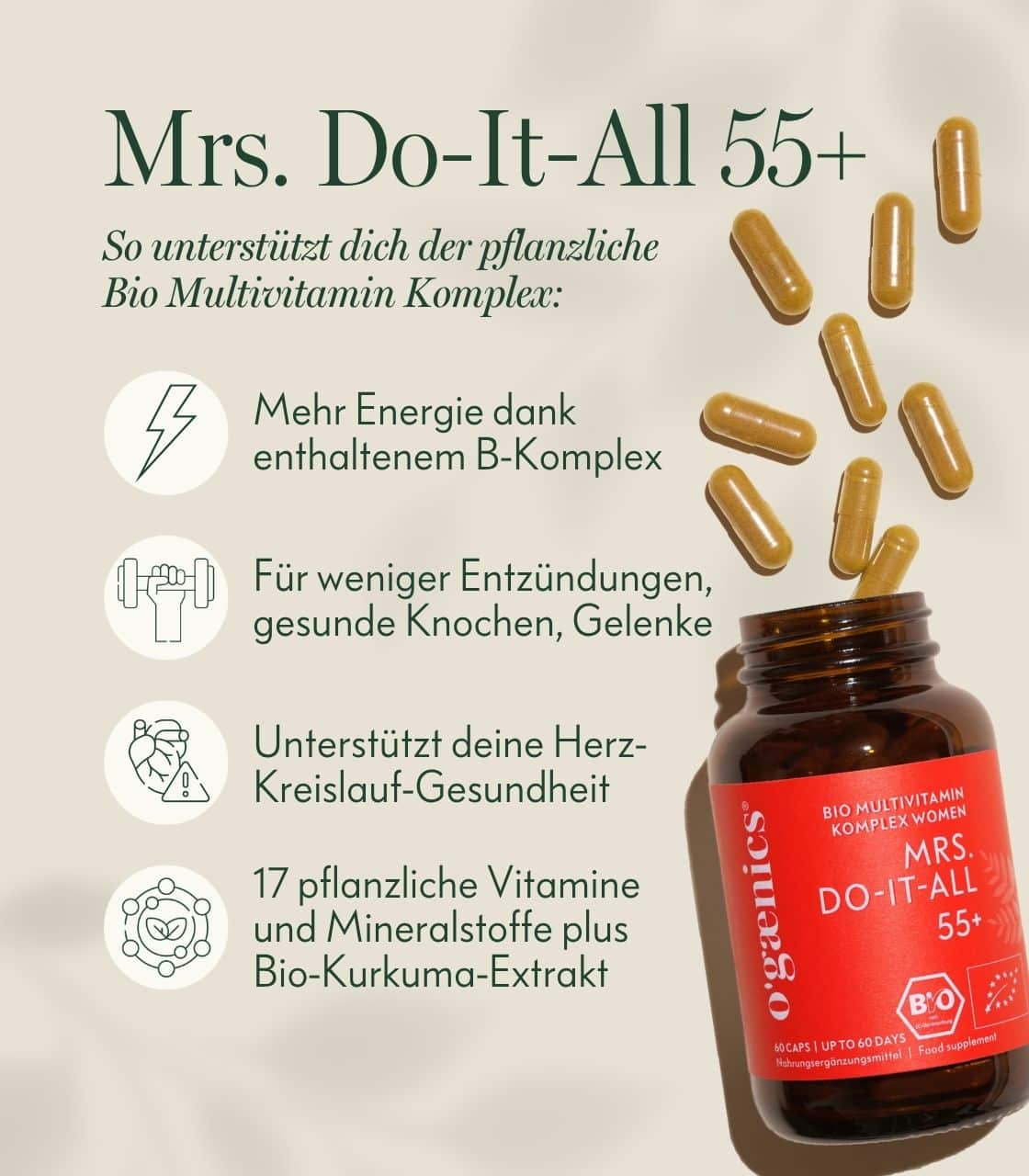 MRS DO-IT-ALL 55+ Bio-Multivitamin für Frauen ab 55 Jahren liefert deinem Körper eine natürliche, rein pflanzliche und bio-zertifizierte Formel für optimale Gesundheit und ein Healthy Aging. Diese besteht aus aus 45 lebenswichtigen Vitaminen, Mineralstoffen, Bio-Superfoods und Bio-Pflanzenwirkstoffen.
