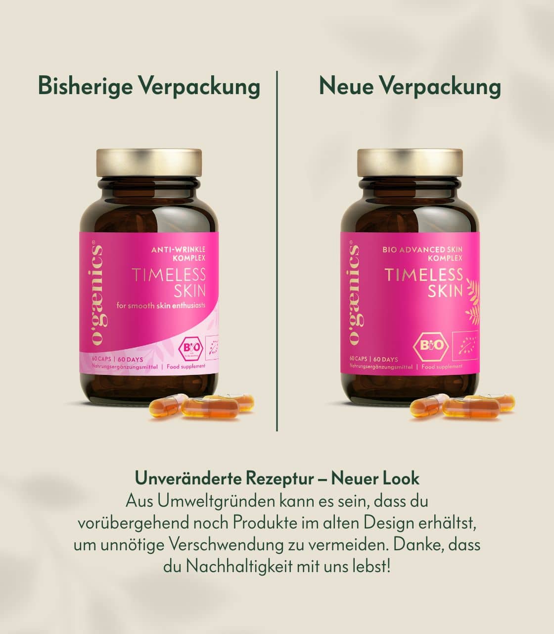 Wir empfehlen die tägliche Einnahme von Timeless Skin über mindestens 8–12 Wochen. Viele unserer Kund:innen integrieren das Produkt dauerhaft in ihre Selfcare-Routine – besonders bei trockener oder reifer Haut. Die Kapseln lassen sich ideal mit allen anderen Ogaenics Produkten kombinieren.