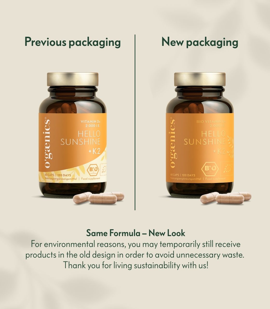 HELLO SUNSHINE plus K2 is an organic nutritional supplement that optimizes your vitamin D3 supply. It is a perfect combo partner for all other Ogaenics organic supplements. If you have questions about a dietary supplement you are taking, please contact hello@ogaenics.com.