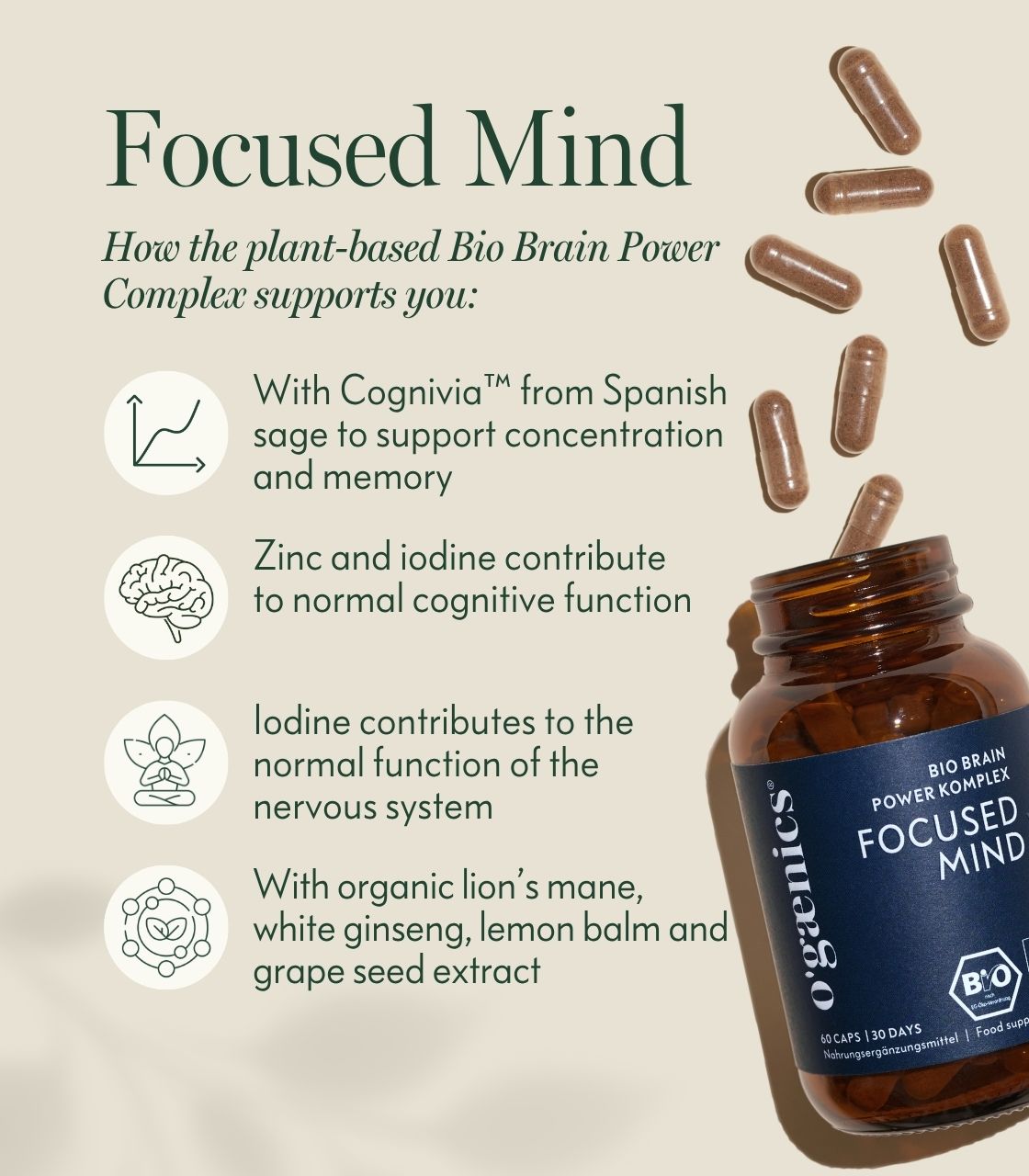 Focused Mind takes a different approach: gentle, plant-based and sustainably effective. The formula combines certified organic plant and mushroom extracts with natural minerals from pure sources – without synthetic vitamins, artificial additives or caffeine.