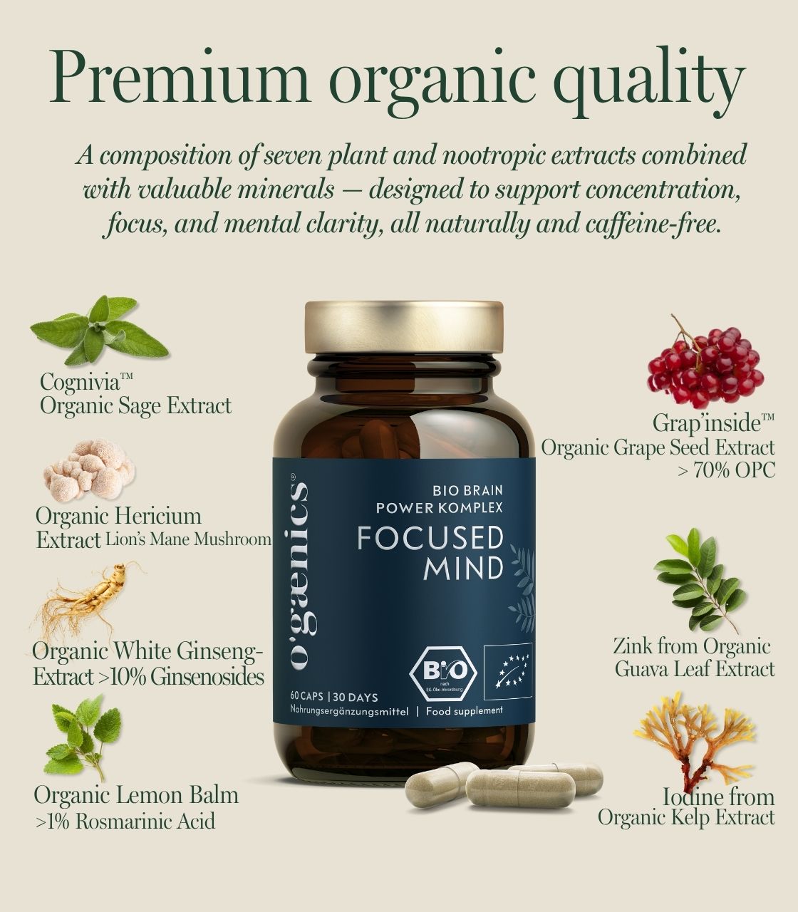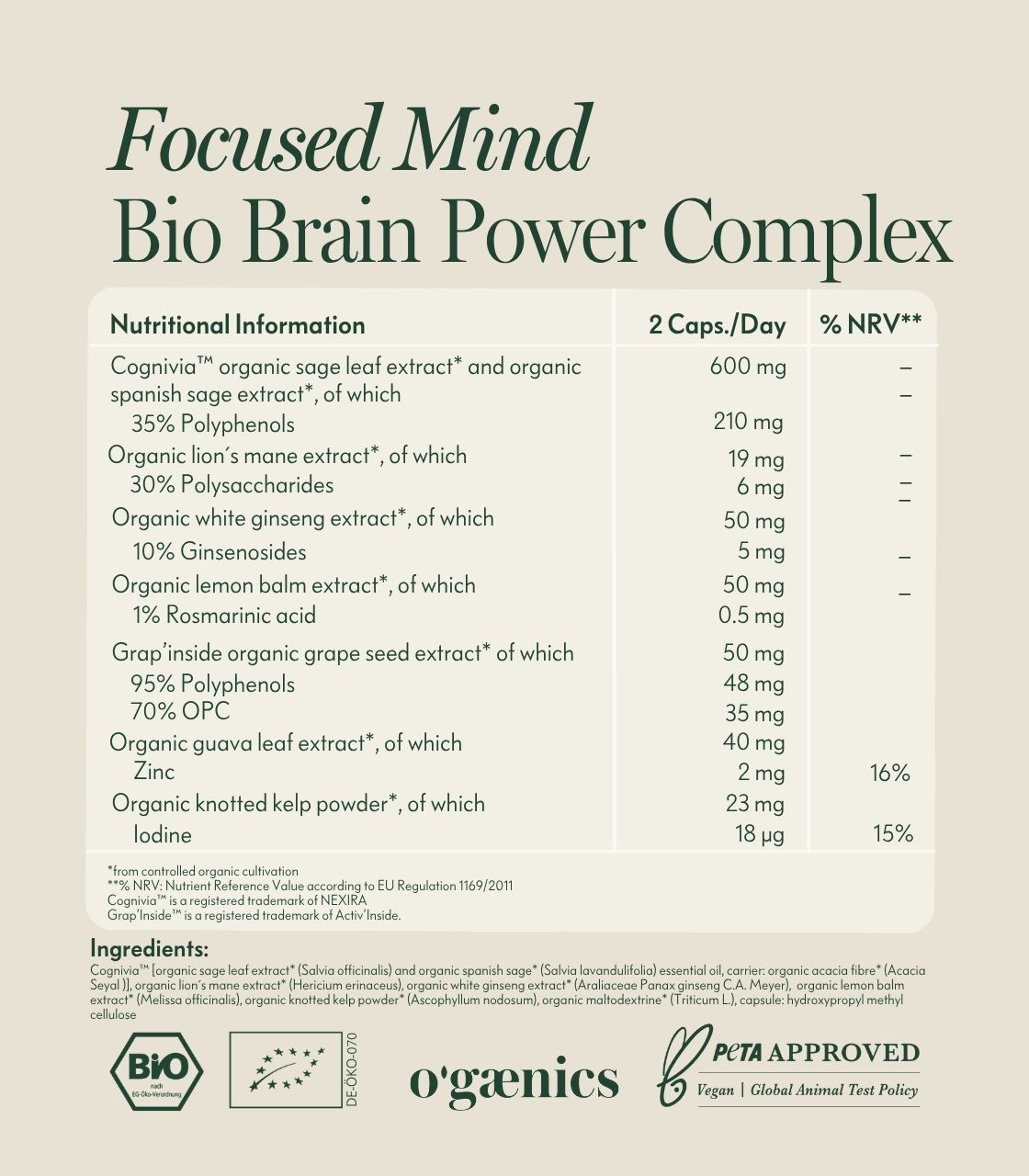- Supplemented with extracts of organic lion’s mane, organic white ginseng, organic lemon balm and organic grape seeds with standardized OPC content