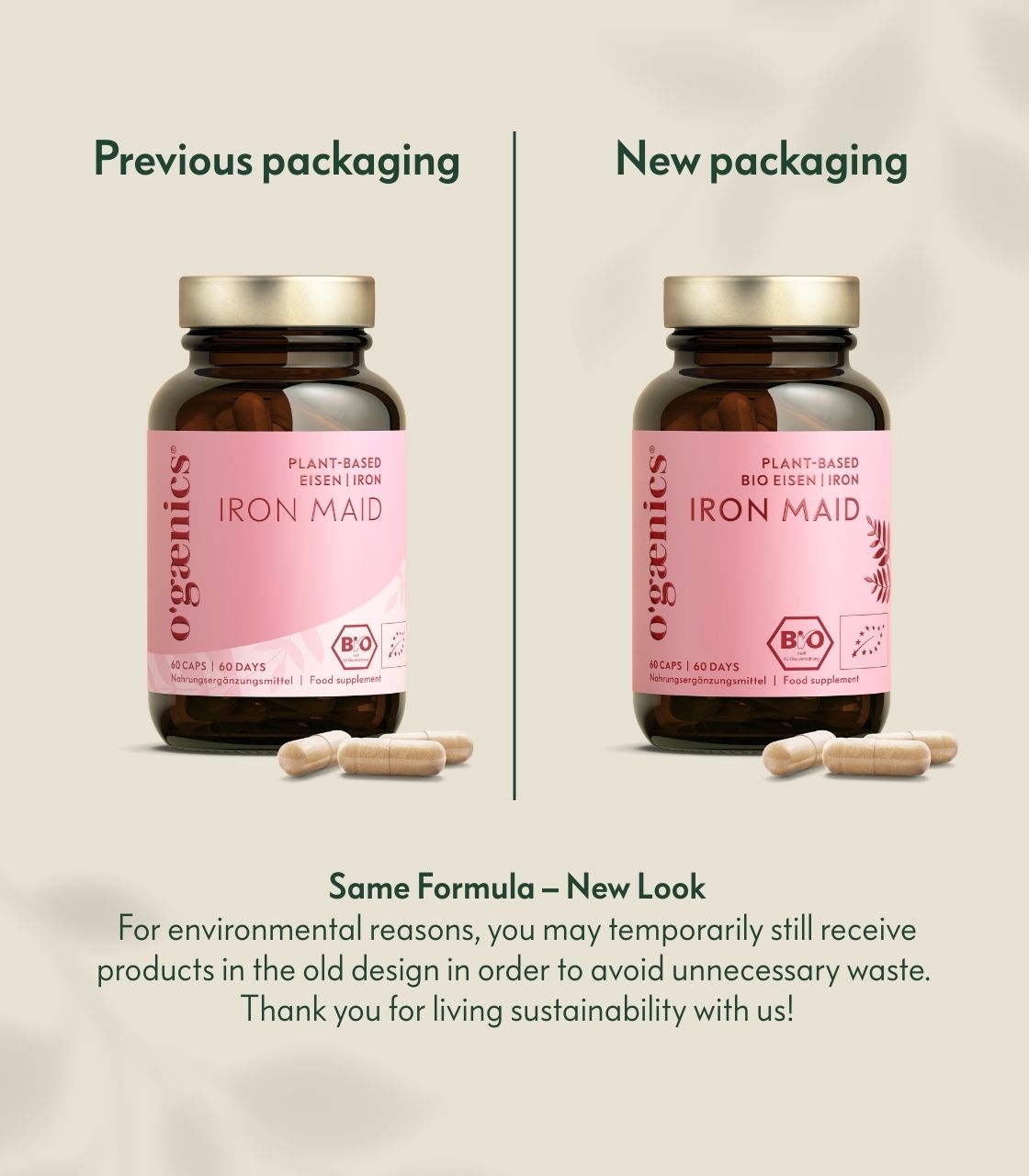 IRON MAID is your purely plant-based basic supply with organic iron and the active enhancer vitamin C from premium raw materials in organic quality, hand-picked compiled, without additives, without genetic engineering and 100% vegan.