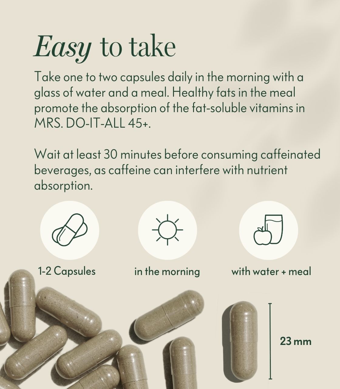 Also, take the capsules with some food, as this will help your body absorb MRS DO IT ALL 45+ and all its ingredients optimally. In order for the fat-soluble vitamins to be optimally absorbed by the body, the meal should also contain healthy fats. This does not have to be a full meal, a small snack is sufficient.
