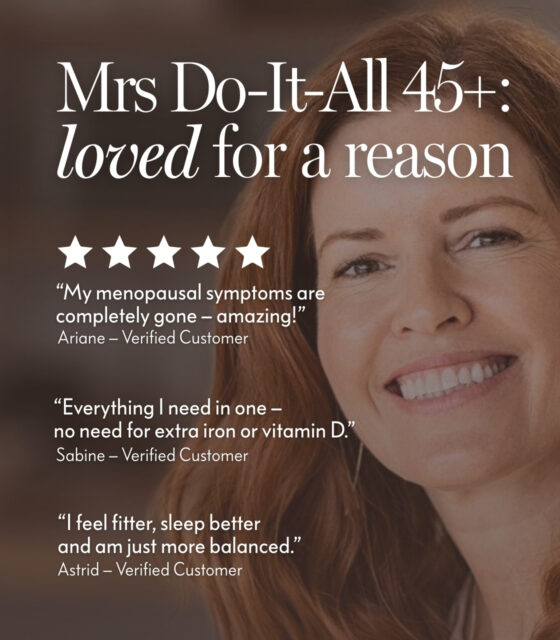 Your body will start to feel the effects of MRS DO-IT-ALL 45+ within 24 hours, as the ingredients support the energy metabolism in the body. In the first month, users report stronger nails, more beautiful hair and more. But the real optimization often becomes apparent after several months and years of continuous use. According to experts, this is associated with improved health, an optimized metabolism and a slower ageing process.
