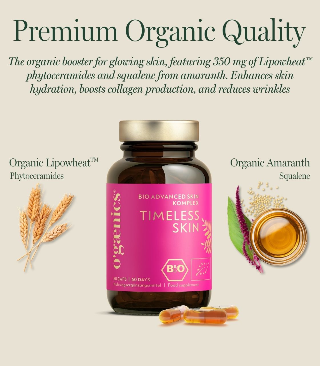 Timeless Skin is a certified organic nutritional supplement with plant-based ceramides and lipids from wheat extract and amaranth squalene – for daily supplementation of a nutrient-conscious skincare routine, for a radiant complexion, especially for mature skin. Each capsule contains a clinically tested dosage of 7mg glucosylceramides and ceramides.