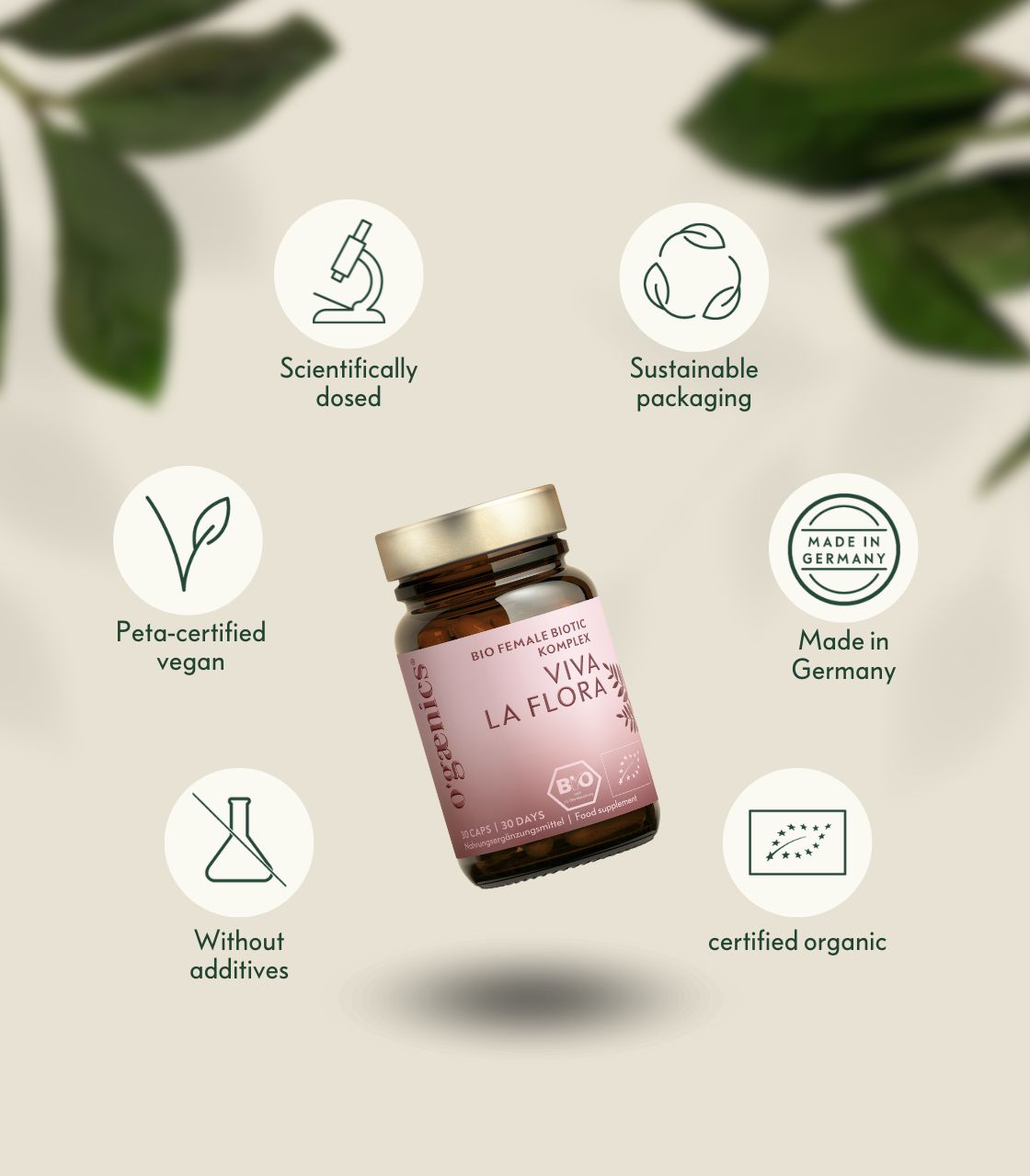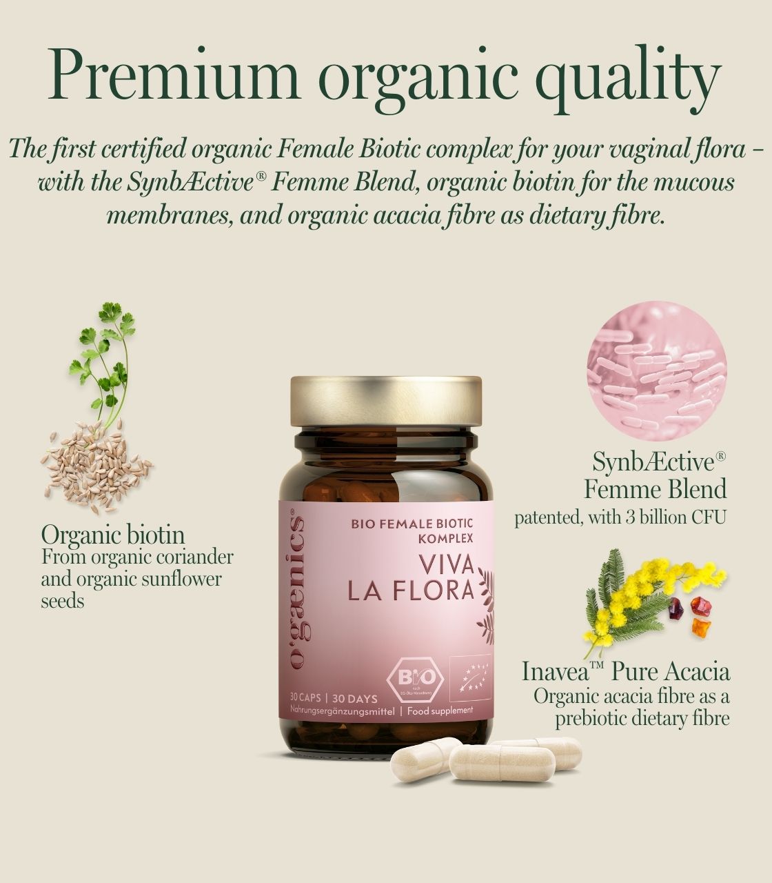 Viva La Flora specifically supports your vaginal health with the patented SynbActive® Femme Blend – three clinically tested, probiotic bacterial strains that occur naturally in healthy vaginal flora and migrate there specifically. In combination with prebiotic organic acacia fiber and organic biotin, Viva La Flora helps to maintain a healthy mucous membrane and a stable vaginal microbiota.
