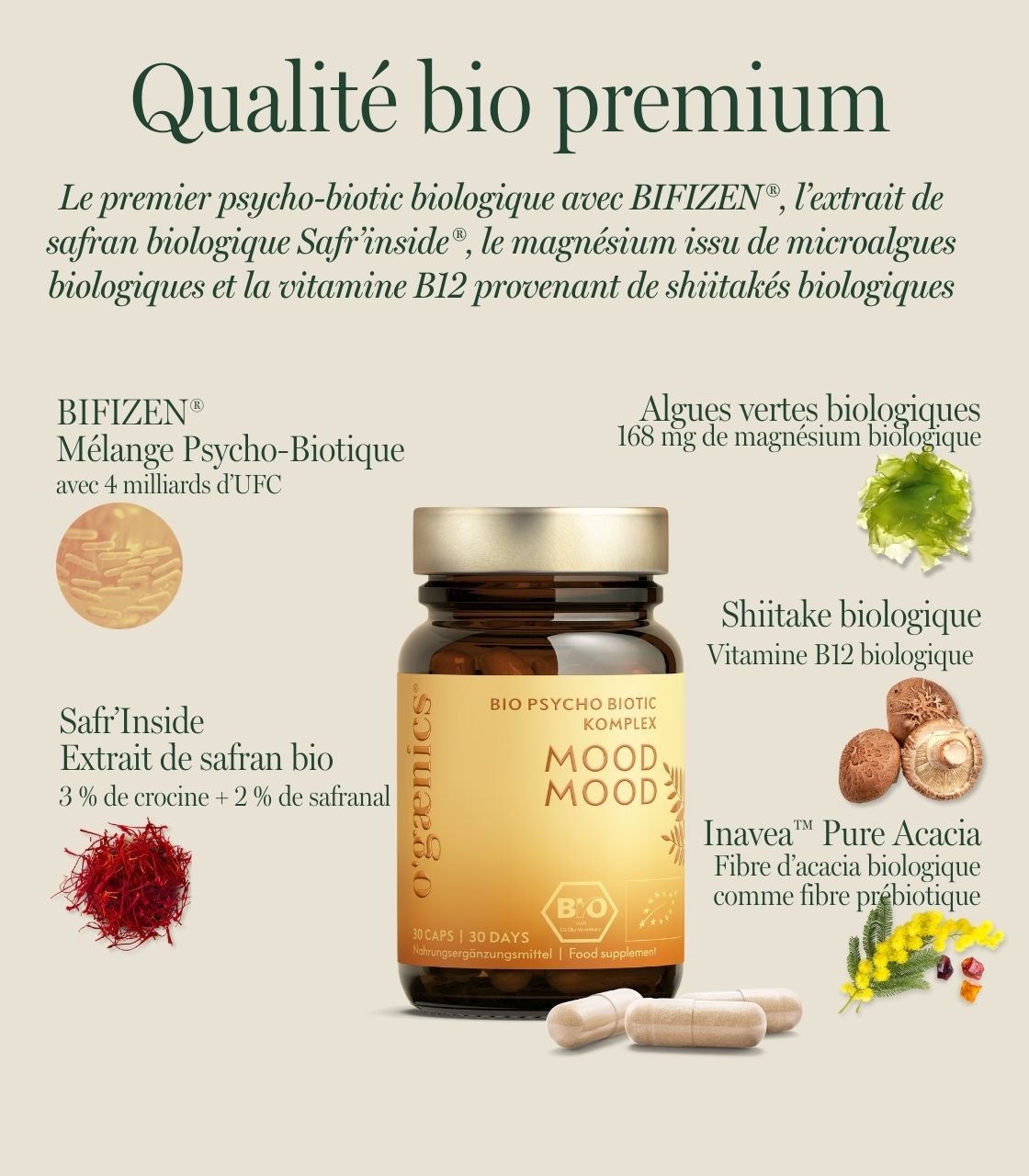 Mood Mood est la première formule d’Ogaenics qui soutient spécifiquement l’axe intestin-cerveau. Elle combine des psychobiotiques testés cliniquement avec du safran bio, de la vitamine B12 de shiitake, du magnésium d’algues vertes et de la fibre d’acacia prébiotique. Sa formule unique soutient la fonction psychique et aide ton système nerveux à rester en équilibre - jour après jour.