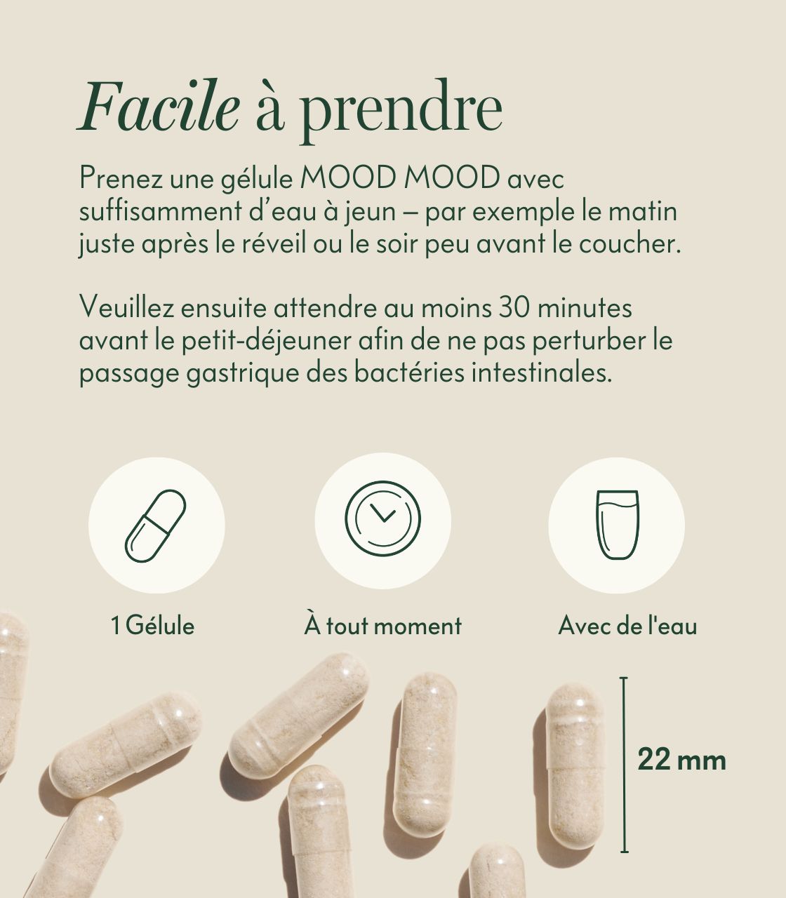 Prends 1 gélule de Mood Mood par jour avec un verre d’eau - soit le soir juste avant d’aller te coucher, soit le matin juste après t’être levé, au moins 30 minutes avant ton premier repas. C’est ainsi que les psychobiotiques peuvent agir au mieux.