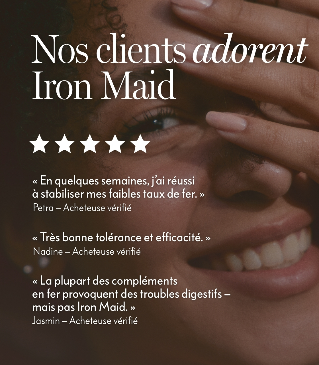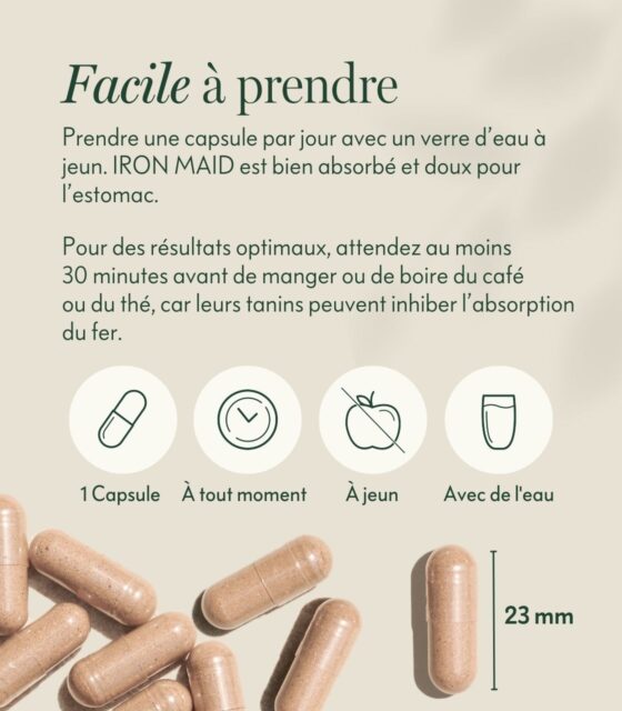 Oui, en concertation avec ton médecin, tu peux déterminer la dose individuelle qui te convient. IRON MAID contient 14 mg de fer élémentaire naturel bio par gélule et couvre ainsi les besoins quotidiens, même si aucun autre fer n’est apporté par l’alimentation.