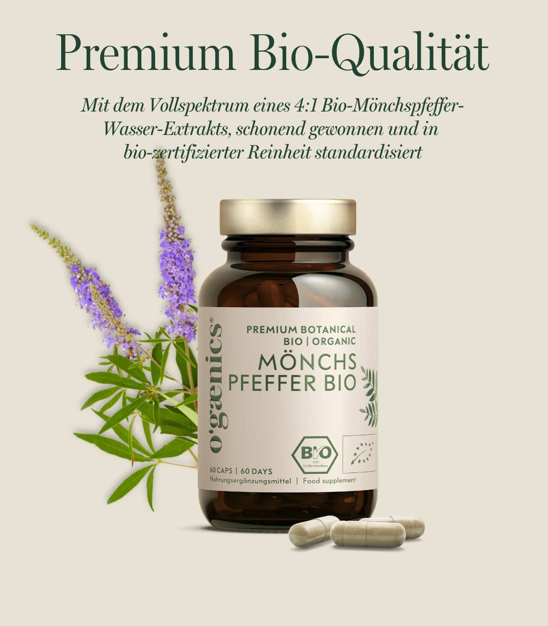 Le Gattilier est traditionnellement utilisé sur une longue période, au moins trois cycles. C’est pourquoi nous utilisons exclusivement des matières premières certifiées biologiques issues de cultures contrôlées. Les baies de Gattilier sont transformées en extrait en France.