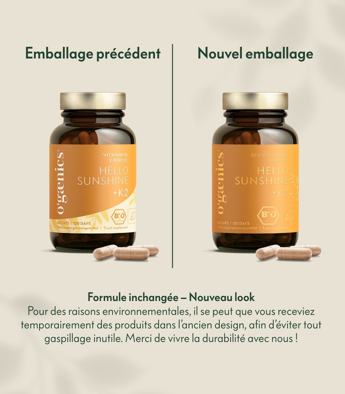 HELLO SUNSHINE plus K2 est un complément alimentaire bio qui optimise ton apport en vitamine D3. C’est un partenaire de combinaison parfait pour tous les autres compléments alimentaires bio d’Ogaenic. Si tu as des questions sur un complément alimentaire que tu prends, n’hésite pas à contacter hello@ogaenics.com.