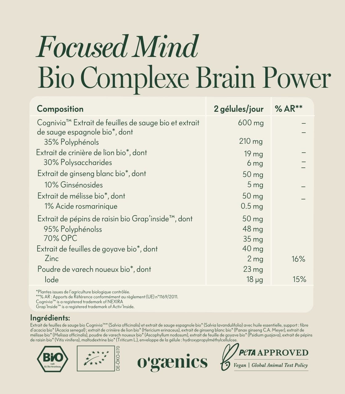 - Complétée par des extraits de crinière de lion bio, de ginseng blanc bio, de mélisse citronnée bio et de pépins de raisin bio à teneur standardisée en OPC