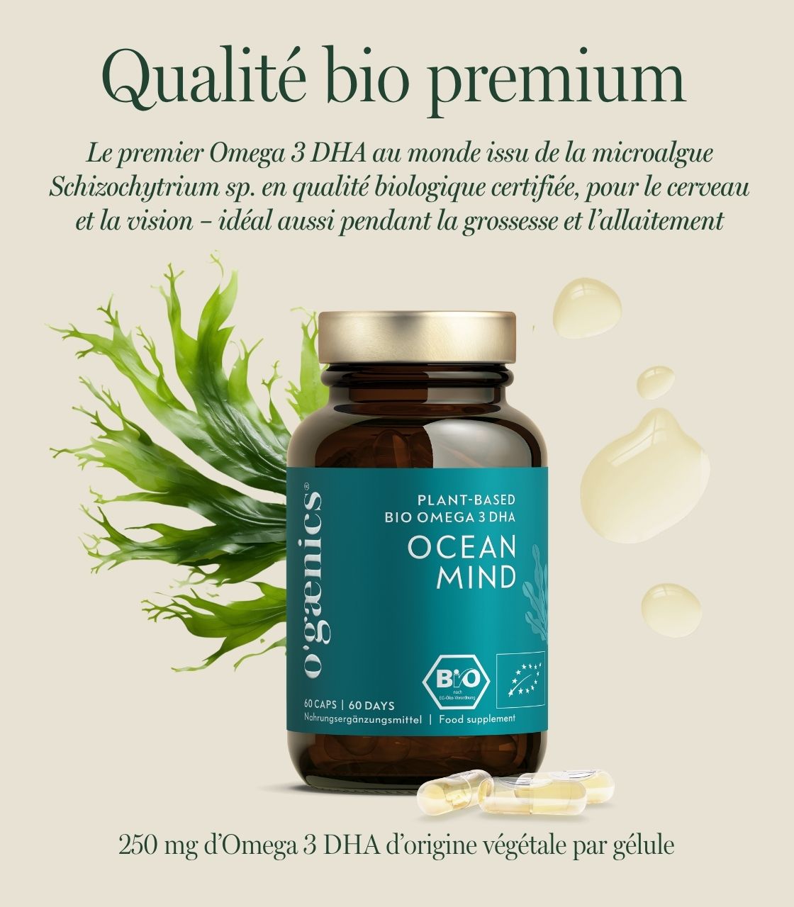 - Oméga 3 DHA végétal bio à base d’huile de microalgues